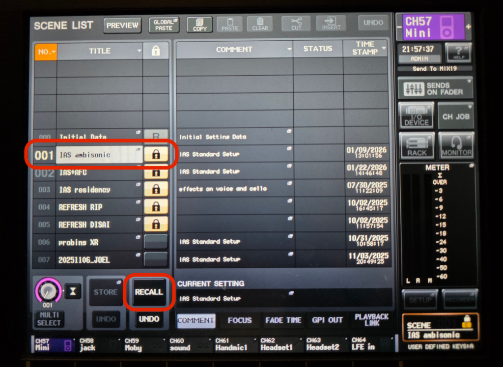 3. On the Yamaha CL3 Mixer, check the field on the bottom-right corner, circled in red below. The “IAS ambisonic” preset should be selected. If not, tap on the “SCENE …” field to open the scene selection menu.